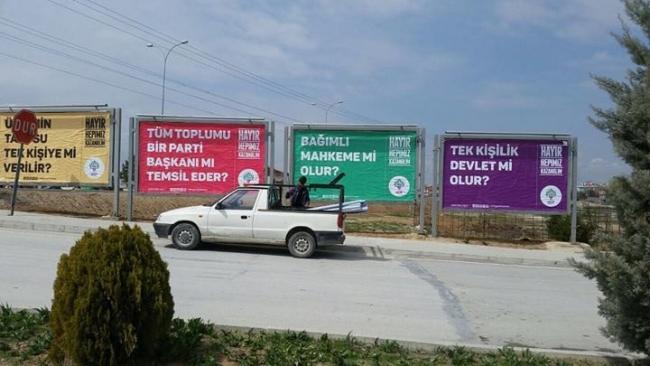 Halkların Demokratik Partisi Cihanbeyli İlçe Örgütünce, İlçe Seçim Kurulunun belirlediği tarihte, Cihanbeyli Merkezinde bulunan Bilboardlara, 16 Nisan 2017 tarihli referandum ile ilgili afişleri, Belediyeye ücreti ödenmek suretiyle asılmıştır. Ancak aynı gün içerisinde bilboardlardaki afişlerin bir kısmını yırttıkları tespit edilmiş ve şüpheliler hakkında suç duyurusunda bulunulmuştur. Şüphelilerin bulunması için İlçe Emniyet Müdürlüğünce bu konuda gerekli araştırma yapılmaktadır. İktidar tarafından her türlü imkan kullanılarak seçim çalışmaları yapıldığı halde, diğer siyasi partilere hiç bir çalışma yaptırılmamaktadır. Buna rağmen basit bir afiş çalışmasına dahi tahammülü olmayan bu iktidarın, demokrasiden, adaletten, eşitlikten bahsetmeye hakkı yoktur. Bu halk her şeyin farkındadır ve 16 Nisan günü her türlü baskı ve zulme gereken cevabını verecektir.