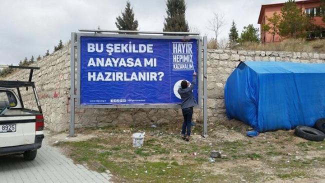 Halkların Demokratik Partisi Cihanbeyli İlçe Örgütünce, İlçe Seçim Kurulunun belirlediği tarihte, Cihanbeyli Merkezinde bulunan Bilboardlara, 16 Nisan 2017 tarihli referandum ile ilgili afişleri, Belediyeye ücreti ödenmek suretiyle asılmıştır. Ancak aynı gün içerisinde bilboardlardaki afişlerin bir kısmını yırttıkları tespit edilmiş ve şüpheliler hakkında suç duyurusunda bulunulmuştur. Şüphelilerin bulunması için İlçe Emniyet Müdürlüğünce bu konuda gerekli araştırma yapılmaktadır. İktidar tarafından her türlü imkan kullanılarak seçim çalışmaları yapıldığı halde, diğer siyasi partilere hiç bir çalışma yaptırılmamaktadır. Buna rağmen basit bir afiş çalışmasına dahi tahammülü olmayan bu iktidarın, demokrasiden, adaletten, eşitlikten bahsetmeye hakkı yoktur. Bu halk her şeyin farkındadır ve 16 Nisan günü her türlü baskı ve zulme gereken cevabını verecektir.