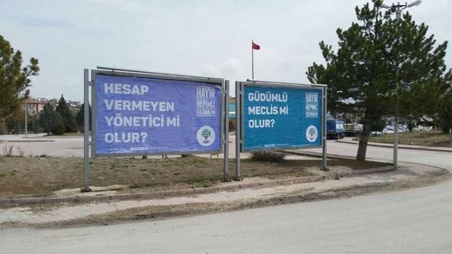 Halkların Demokratik Partisi Cihanbeyli İlçe Örgütünce, İlçe Seçim Kurulunun belirlediği tarihte, Cihanbeyli Merkezinde bulunan Bilboardlara, 16 Nisan 2017 tarihli referandum ile ilgili afişleri, Belediyeye ücreti ödenmek suretiyle asılmıştır. Ancak aynı gün içerisinde bilboardlardaki afişlerin bir kısmını yırttıkları tespit edilmiş ve şüpheliler hakkında suç duyurusunda bulunulmuştur. Şüphelilerin bulunması için İlçe Emniyet Müdürlüğünce bu konuda gerekli araştırma yapılmaktadır. İktidar tarafından her türlü imkan kullanılarak seçim çalışmaları yapıldığı halde, diğer siyasi partilere hiç bir çalışma yaptırılmamaktadır. Buna rağmen basit bir afiş çalışmasına dahi tahammülü olmayan bu iktidarın, demokrasiden, adaletten, eşitlikten bahsetmeye hakkı yoktur. Bu halk her şeyin farkındadır ve 16 Nisan günü her türlü baskı ve zulme gereken cevabını verecektir.