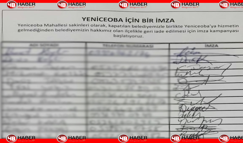 Geçtiğimiz günlerde ybhaber.com da duyurduğumuz imza kampanyasına bugün start verildi. Yeniceoba için BİR imza sloganıyla başlayan kampanyamıza halkın ilgisi yoğundu. Kısa süre içinde yüzlerce imza toplandı. Başlattığımız bu anlamlı imza kampanyasına civar mahallerlerinde ilk günden beri ilgisi yoğundu. Hepimiz YENİCEOBA'ya yapılan haksızlık karşısında Tek Yürek Tek Ses olmaktayız.